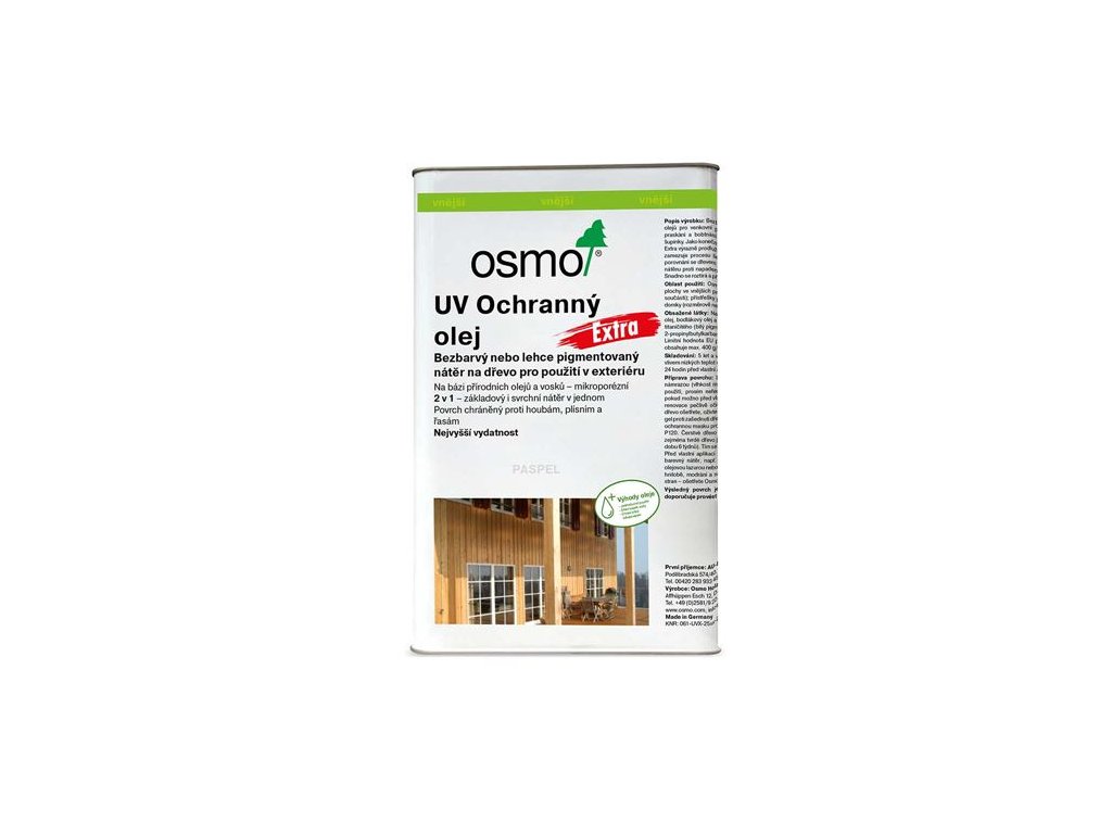 Osmo UV Ochranný olej č. 410 je bezbarvý polomatný ochranný nátěr na dřevo na bázi přírodních olejů k použití ve vnitřních i vnějších prostorách. Je prodyšný, umožňuje dřevu dýchat a snižuje bobtnání a sesychání dřeva. Odpuzuje vodu. Neodprýskává se, nepraská, neodlupuje se a netvoří puchýřky. Je pro lidi, kteří vyznávají zdravý styl života a upřednostňují dřevo povrchově ošetřit výrobkem, který neobsahuje žádné biocidní účinné látky. Výrobek Osmo UV Ochranný olej č. 410 jako finální nátěr na již dříve tónované dřevo výrazně zvyšuje interval mezi jednotlivými renovacemi. Pokud je aplikován samostatně výrobek Osmo UV Ochranný olej, pak vzhledem k UV ochrannému faktoru 12 (v porovnání s neošetřeným dřevem) postačí dva nátěry k ochraně proti šednutí svislých dřevěných ploch při venkovních i vnitřních aplikacích. Jednoduché přetření bez nezbytnosti broušení. Snadná aplikace. Během natírání nezasychá. Po zaschnutí je nátěr bezpečný pro lidi, zvířata i rostliny a je vhodný i pro použití na dětské hračky v souladu s požadavky normy EN 71.3 Všechny svislé dřevěné plochy v interiéru a exteriéru: obložení stěn a stropů, dveře, okna a okenice (rozměrově stálé dřevěné prvky), přístřešky pro auta, dřevěné fasády, balkóny, ploty, pergoly, zahradní nábytek a zahradní domky.
