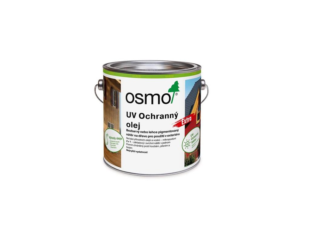 Osmo UV Ochranný olej č. 410 je bezbarvý polomatný ochranný nátěr na dřevo na bázi přírodních olejů k použití ve vnitřních i vnějších prostorách. Je prodyšný, umožňuje dřevu dýchat a snižuje bobtnání a sesychání dřeva. Odpuzuje vodu. Neodprýskává se, nepraská, neodlupuje se a netvoří puchýřky. Je pro lidi, kteří vyznávají zdravý styl života a upřednostňují dřevo povrchově ošetřit výrobkem, který neobsahuje žádné biocidní účinné látky. Výrobek Osmo UV Ochranný olej č. 410 jako finální nátěr na již dříve tónované dřevo výrazně zvyšuje interval mezi jednotlivými renovacemi. Pokud je aplikován samostatně výrobek Osmo UV Ochranný olej, pak vzhledem k UV ochrannému faktoru 12 (v porovnání s neošetřeným dřevem) postačí dva nátěry k ochraně proti šednutí svislých dřevěných ploch při venkovních i vnitřních aplikacích. Jednoduché přetření bez nezbytnosti broušení. Snadná aplikace. Během natírání nezasychá. Po zaschnutí je nátěr bezpečný pro lidi, zvířata i rostliny a je vhodný i pro použití na dětské hračky v souladu s požadavky normy EN 71.3 Všechny svislé dřevěné plochy v interiéru a exteriéru: obložení stěn a stropů, dveře, okna a okenice (rozměrově stálé dřevěné prvky), přístřešky pro auta, dřevěné fasády, balkóny, ploty, pergoly, zahradní nábytek a zahradní domky.