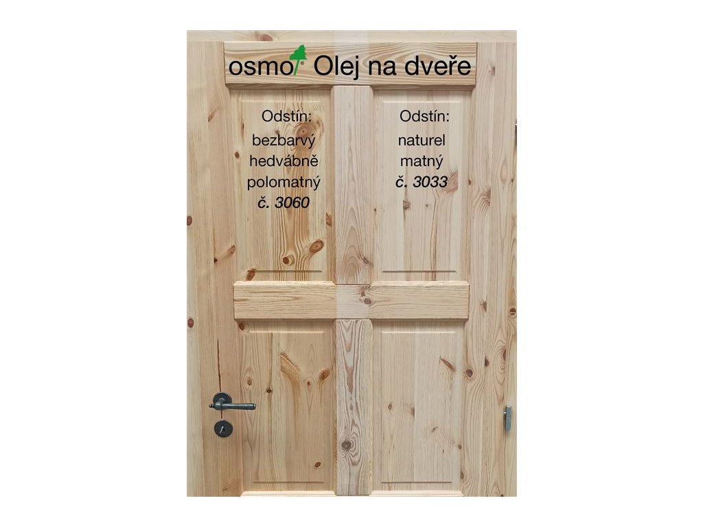 Osmo Olej na dveře je ideální pro ochranu dřevěných interiérových dveří z masivu a některých dýhovaných dveří ( dle doporučení výrobců dveří). Bezbarvý hedvábně matný nebo alternativně v odstínu naturel finální nátěr na dřevo, který kombinuje výhody přírodních olejů a vosků v jednom výrobku. Osmo Olej na dveře je odolný vůči nečistotám, vodě a otěru a zajišťuje hladký povrch dřeva. Je jednoduše aplikovatelný, bez nutnosti použít podkladový nátěr nebo mezioperační přebrušování, což představuje úsporu času i finančních prostředků. Je vhodný pro dřevěné povrchy - nepraská, neodlupuje se a netvoří šupinky. Je odolný vůči vínu, pivu, nápojům typu Cola, kávě, čaji, ovocným šťávám, mléku a vodě v souladu s požadavky normy DIN 68861-1A - zamezuje vzniku stop po vodě. Uschlý nátěr je nezávadný pro lidi, zvířata a rostliny a je vhodný pro dětské hračky podle EN 71.3, odolný vůči slinám a potu podle DIN 53160. Počet nátěrů: dva nátěry Vydatnost: 1 l výrobku vystačí při jednom nátěru na cca 24 m2. Vydatnost závisí do značné míry na charakteristice dřeva. Uvedené hodnoty se vztahují na hladké hoblované/řezané dřevěné povrchy, u ostatních povrchů se může vydatnost snižovat. Doba životnosti je 5 let a déle, je-li výrobek uchováván v těsně uzavřených obalech v suchu. Pokud výrobek vlivem mrazu zhoustne, je třeba ho pro znovunabytí původní konzistence ponechat při pokojové teplotě po dobu 24 – 36 hodin před vlastní aplikací.