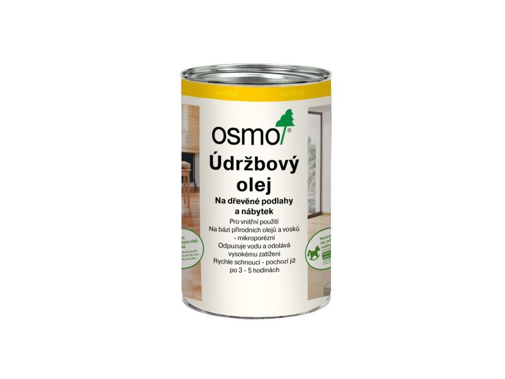 Osmo Údržbový olej zajišťuje hloubkovou péči i běžnou údržbu olejovaných podlah. Zašlé a matné podlahy Osmo Údržbový olej oživí. Při včasném použití Osmo Údržbového oleje (neošetřené dřevo nesmí být vystaveno okolním vlivům) zabráníte pracnému broušení a nutnosti provádět renovační nátěry. Je určený pro všechny olejované dřevěné podlahy jako jsou podlahy z masivního dřeva, masivní prkna, parkety, palubky, OSB desky a korkové podlahy stejně jako pro schodiště a nábytek. Zvláště doporučeno pro použití u silně namáhaných podlah (restaurace, muzea a další typy silně namáhaných podlah).