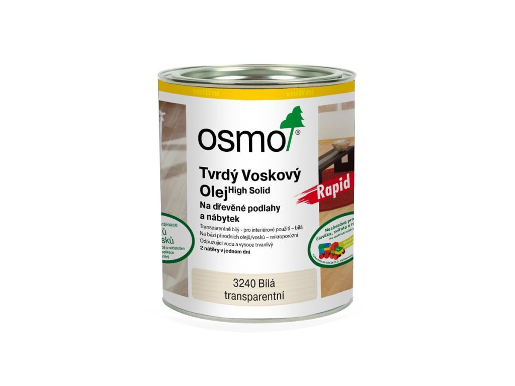 Osvědčený Tvrdý voskový olej v rychle schnoucí variantě – 2 nátěry proveditelné v 1 den! Bezbarvý, k použití uvnitř Obzvláště se doporučuje pro masivní podlahové palubky, selská prkna, parketové podlahy, OSB a korkové podlahy Tvrdý voskový olej Rapid zesiluje barevnou intenzitu přírodního vzhledu povrchu dřeva, je odolný vůči ošlapání, odpuzuje vodu a nečistoty, je trvale zatížitelný a mimořádně odolný. Počet nátěrů: U dřeva bez povrchové úpravy dva nátěry, v případě renovace stačí zpravidla jeden nátěr na očištěný povrch – bez obrušování ! 1 litr stačí při jednom nátěru na cca 24 m2