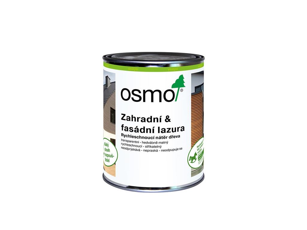Extrémně odolná barva vůči povětrnostním podmínkám a UV – záření. Transparentně barevný, hedvábně matný nátěr do exteriéru. Uschlý nátěr je nezávadný pro lidi, zvířata a rostliny (odolný vůči slinám a potu podle DIN 53160, vhodný pro dětské hračky podle EN 71.3). Rychleschnoucí nátěr dřeva. Osmo Zahradní and fasádní lazura je vhodná pro ošetření jakéhokoliv dřeva ve venkovním prostředí: dřevěných fasád, balkónů, dřevěných okenic, plotů, zahradních domků, pergol, zahradního nábytku, parkovacích přístřešků apod. Počet nátěrů: u dřeva bez povrchové úpravy dva nátěry. S Osmo plochým štětcem, Osmo válečkem z mikrovlákna nebo Rounem na olejové nátěry. Nanášejte rychle, v tenké vrstvě a ve směru vláken dřeva. Popřípadě naneste nástřikem. Ponechte schnout při dobrém větrání po dobu 3–4 hodiny. Poté zaschnutý povrch přebruste a proveďte druhý nátěr v tenké vrstvě. Při renovacích postačí zpravidla jeden nátěr. 1 l výrobku vystačí při jednom nátěru na cca 16 m2. Vydatnost závisí do značné míry na stavu dřeva. Uvedené hodnoty se vztahují na hladké hoblované/broušené dřevěné povrchy, u ostatních povrchů se může vydatnost odlišovat.
