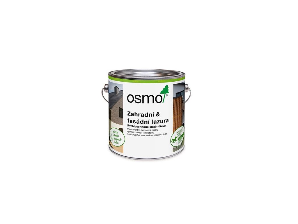 Extrémně odolná barva vůči povětrnostním podmínkám a UV – záření. Transparentně barevný, hedvábně matný nátěr do exteriéru. Uschlý nátěr je nezávadný pro lidi, zvířata a rostliny (odolný vůči slinám a potu podle DIN 53160, vhodný pro dětské hračky podle EN 71.3). Rychleschnoucí nátěr dřeva. Osmo Zahradní and fasádní lazura je vhodná pro ošetření jakéhokoliv dřeva ve venkovním prostředí: dřevěných fasád, balkónů, dřevěných okenic, plotů, zahradních domků, pergol, zahradního nábytku, parkovacích přístřešků apod. Počet nátěrů: u dřeva bez povrchové úpravy dva nátěry. S Osmo plochým štětcem, Osmo válečkem z mikrovlákna nebo Rounem na olejové nátěry. Nanášejte rychle, v tenké vrstvě a ve směru vláken dřeva. Popřípadě naneste nástřikem. Ponechte schnout při dobrém větrání po dobu 3–4 hodiny. Poté zaschnutý povrch přebruste a proveďte druhý nátěr v tenké vrstvě. Při renovacích postačí zpravidla jeden nátěr. 1 l výrobku vystačí při jednom nátěru na cca 16 m2. Vydatnost závisí do značné míry na stavu dřeva. Uvedené hodnoty se vztahují na hladké hoblované/broušené dřevěné povrchy, u ostatních povrchů se může vydatnost odlišovat.Doplňkové parametry